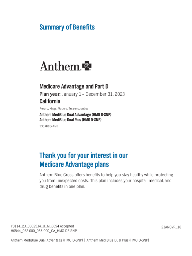 Summary of Benefits Medicare Advantage and Part D Plan year: January 1 December 31, 2023California Fresno, Kings, Madera, Tulane countiesAnthem Edible Dual Advantage (HMO DSP) Anthem Edible Dual Plus