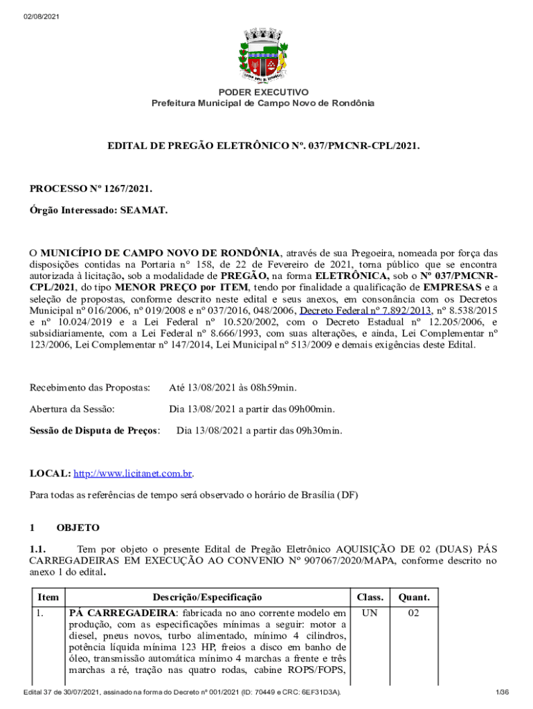 02/08/2021PODER EXECUTIVE Prefecture Municipal DE Camp Nov ode RondniaEDITAL DE PRESO ELECTRIC N. 037/PMCNRCPL/2021.PROCESS N 1267/2021. RGO Interested: SEAMAN. O MUNICIPAL DE CAMP NOV ODE RONDÔNIA,
