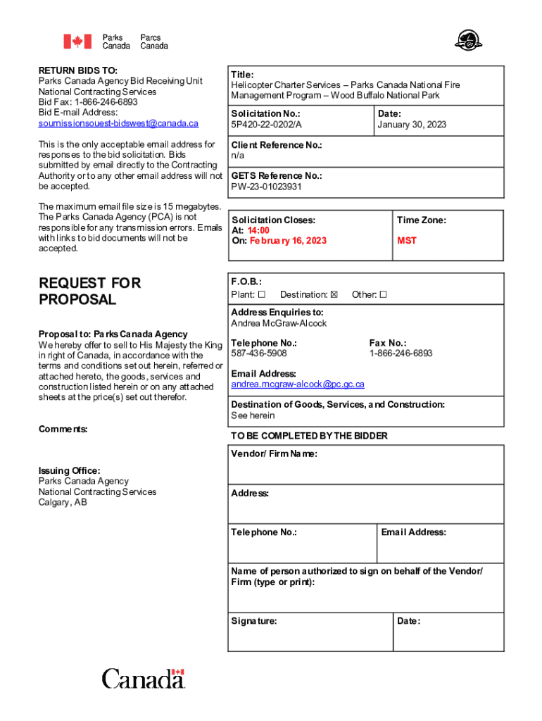 RETURN BIDS TO: Parks Canada Agency Bid Receiving Unit National Contracting Services Bid Fax: 18662466893 Bid Email Address: soumissionsouestbidswest@canada.caTitle: Helicopter Charter Services Parks