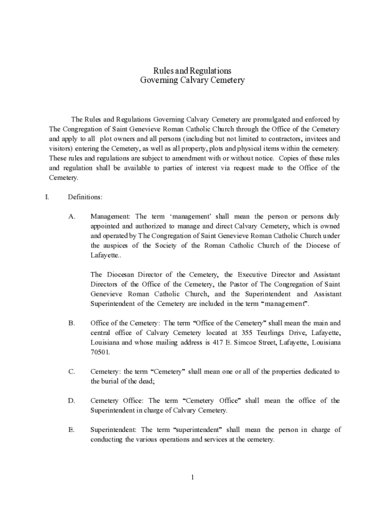 Get the free Rules and Regulations Governing Calvary Cemetery - Lafayette