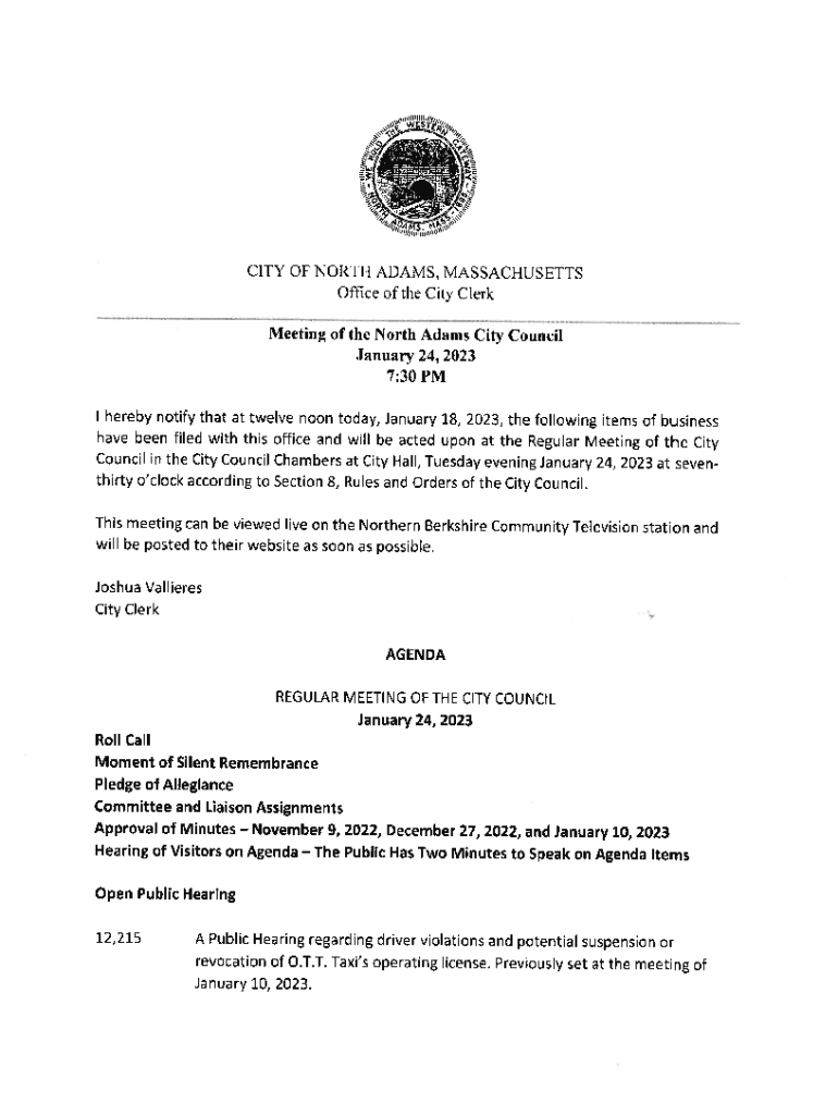CITY OF NORTH ADAMS, MASSACHUSETTS Office of the City Clerk Meeting of the North Adams City Council January 24, 2023 7:30 PM I hereby notify that at twelve noon today, January 18, 2023, the following