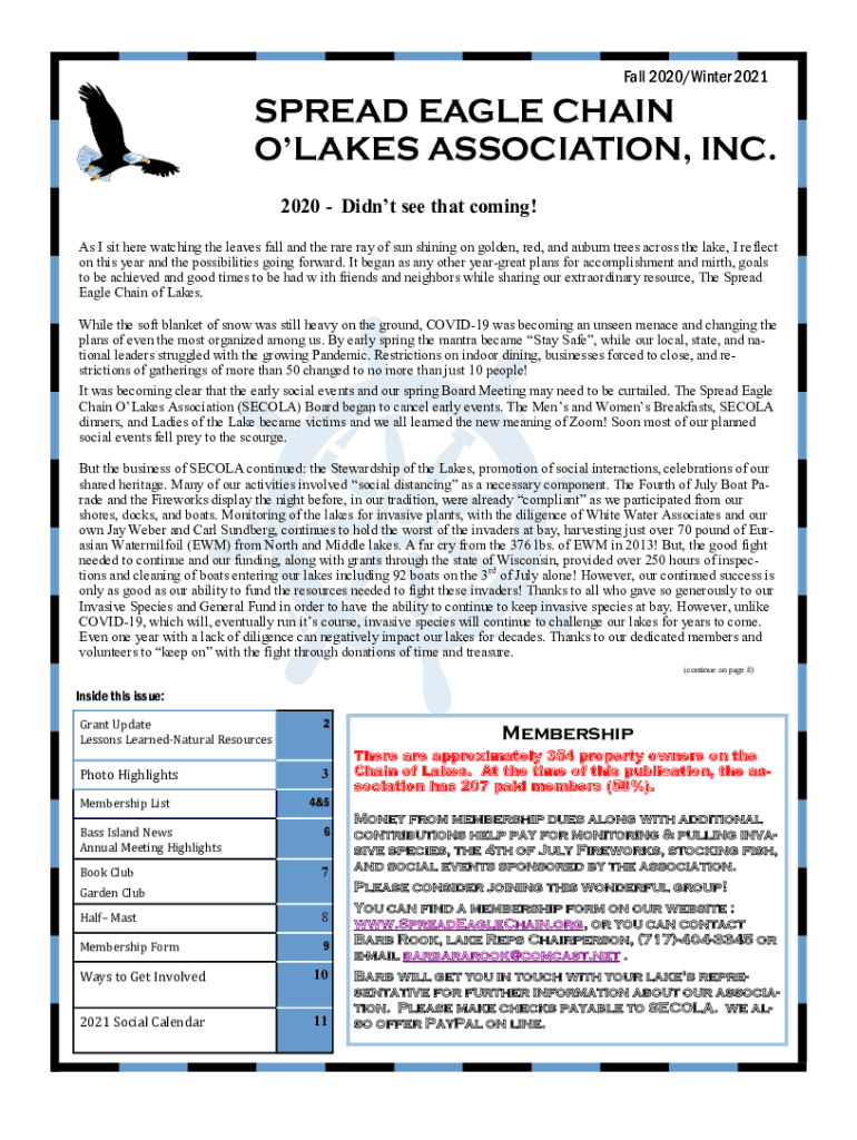 Fall 2020/Winter 2021SPREAD EAGLE CHAIN LAKES ASSOCIATION, INC. 2020 Didn't see that coming! As I sit here watching the leaves fall and the rare ray of sun shining on golden, red, and auburn trees