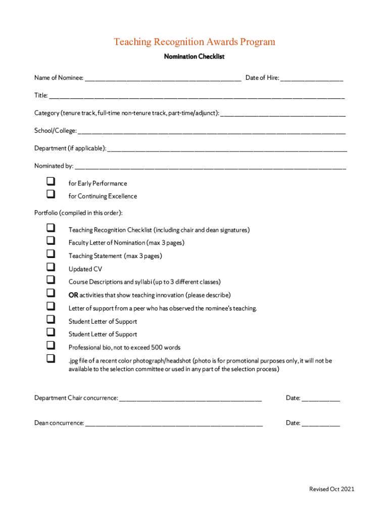 Teaching Recognition Awards Program Nomination Checklist Name of Nominee: ___ Date of Hire: ___ Title: ___ Category (tenure track, full time nontenured track, part-time/adjunct): ___ School/College: