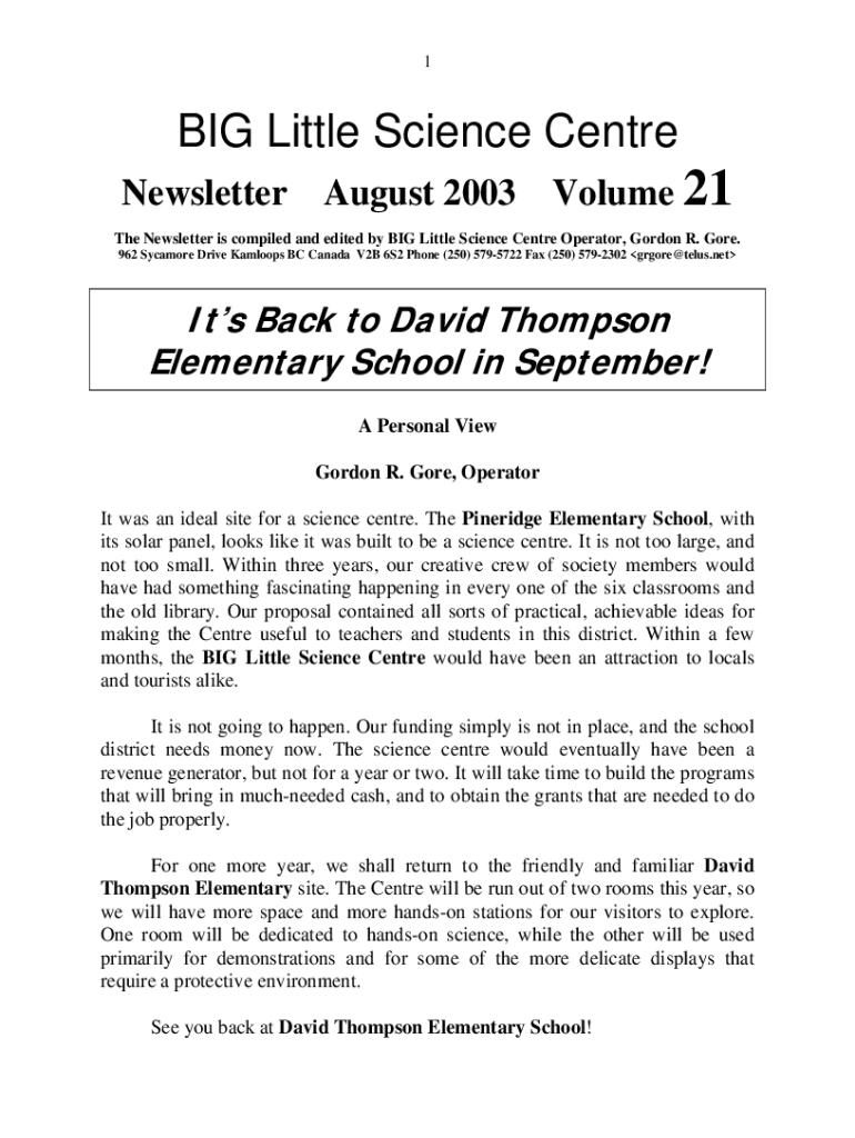 Newsletter August 2003Volume 21The Newsletter is compiled and edited by BIG Little Science Center Operator, Gordon R. Gore.