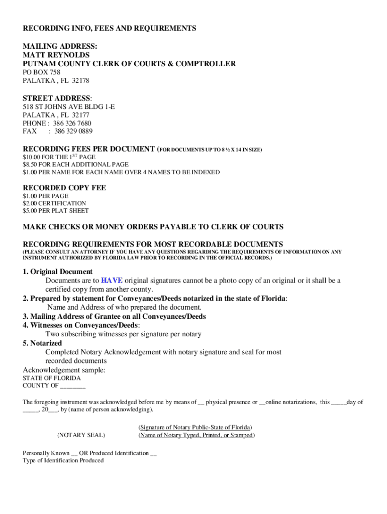 RECORDING INFO, FEES AND REQUIREMENTS MAILING ADDRESS: MATT REYNOLDS PUTNAM COUNTY CLERK OF COURTS & COMPTROLLER PO BOX 758 ALASKA, FL 32178STREET ADDRESS: 518 ST JOHNS AVE BLDG 1E ALASKA, FL 32177