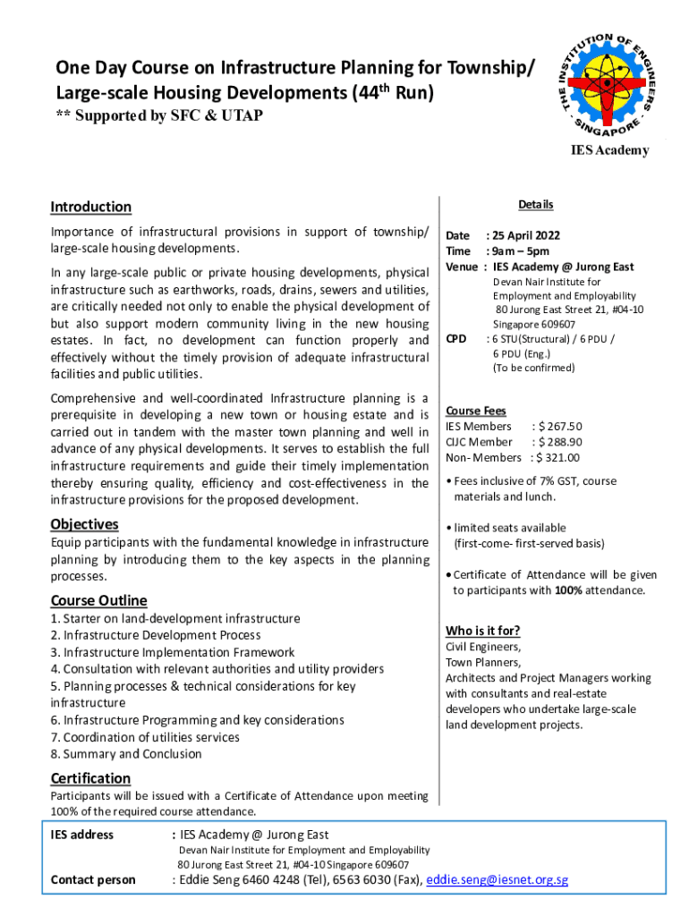 One Day Course on Infrastructure Planning for Township/ Large scale Housing Developments (44th Run) ** Supported by SFC & UTA PIES AcademyDetailsIntroduction Importance of infrastructural provisions