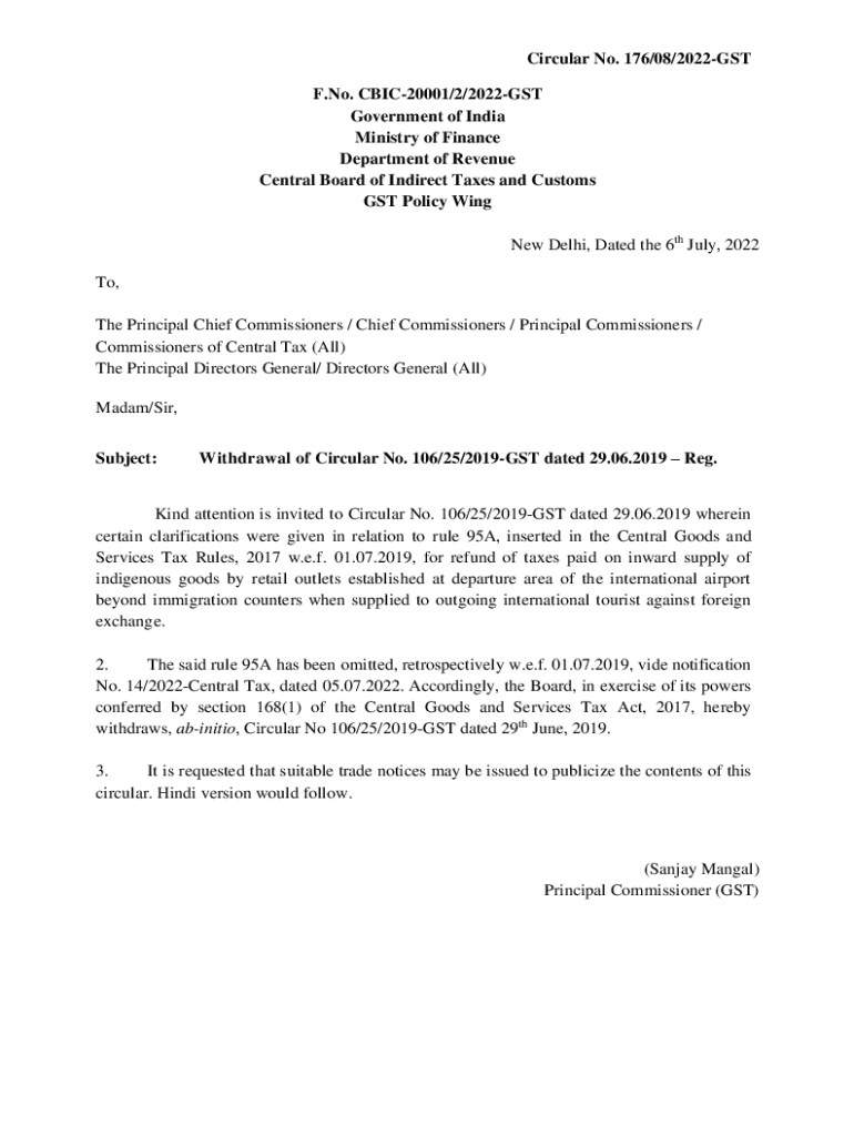 Circular No. 176/08/2022GST F. No. CBIC20001/2/2022GST Government of India Ministry of Finance Department of Revenue Central Board of Indirect Taxes and Customs GST Policy Wing New Delhi, Dated the