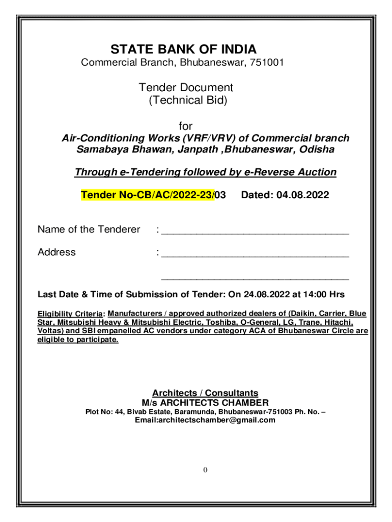 STATE BANK OF INDIA Commercial Branch, Bhubaneswar, 751001Tender Document (Technical Bid) for Air-conditioning Works (VRF/VRV) of Commercial branch Surabaya Shawn, Jan path, Bhubaneswar, Odisha Through