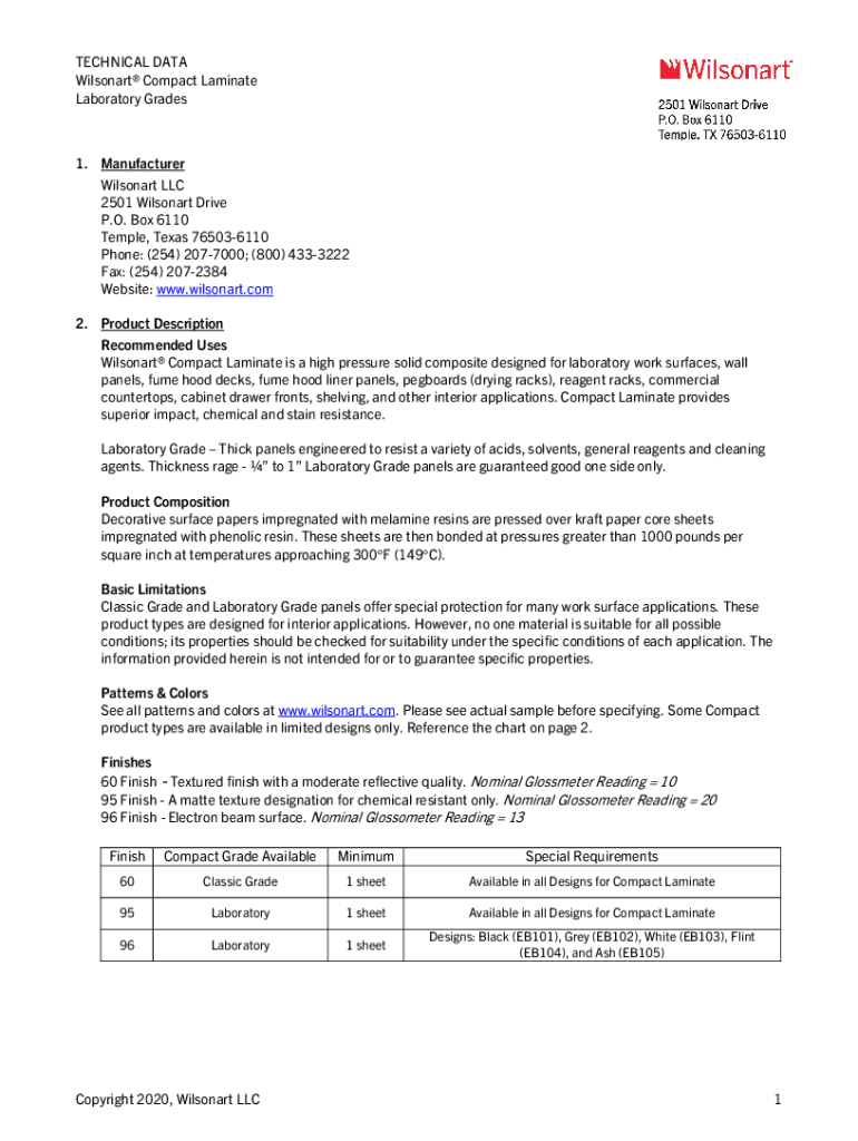 TECHNICAL DATA Wilson art Compact Laminate Laboratory Grades1. Manufacturer Wilson art LLC 2501 Wilson art Drive P.O. Box 6110 Temple, Texas 765036110 Phone: (254) 2077000; (800) 4333222 Fax: (254)