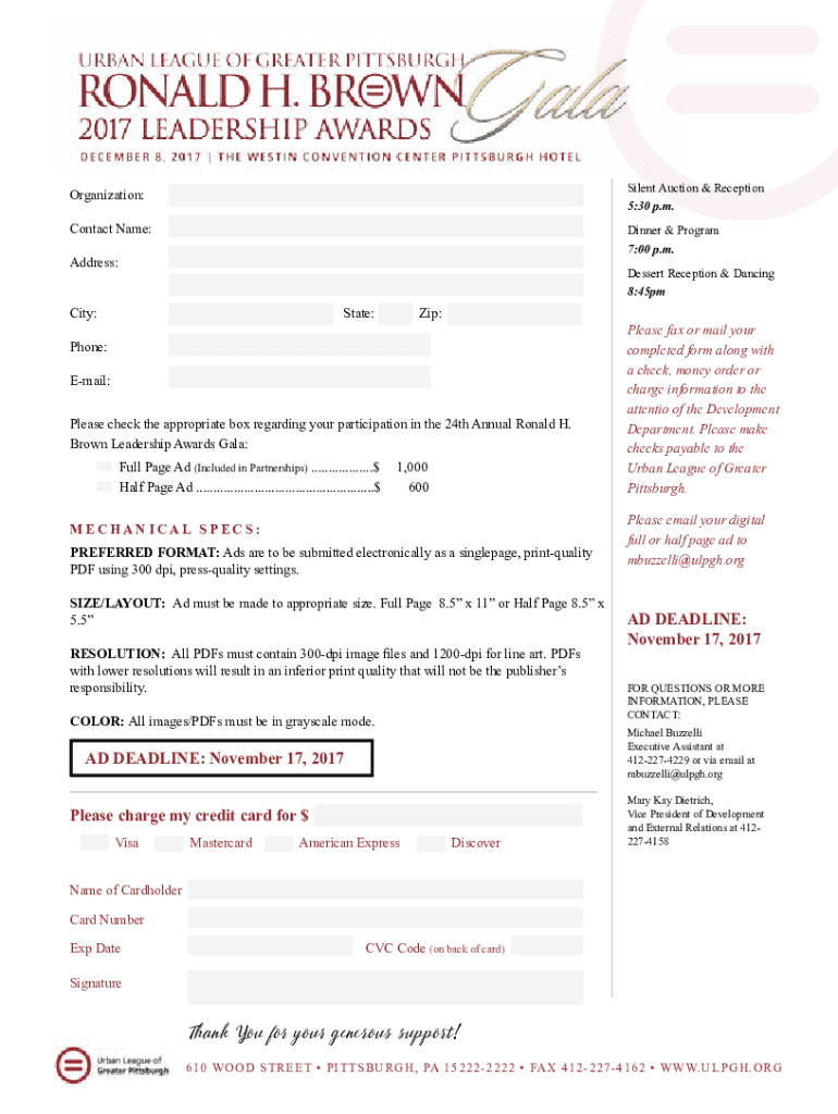 Silent Auction & Reception 5:30 p.m. Organization: Contact Name:Dinner & Program 7:00 p.m. Address:Dessert Reception & Dancing 8:45pmCity:State:Zip:Phone:Email: Please check the appropriate box regarding