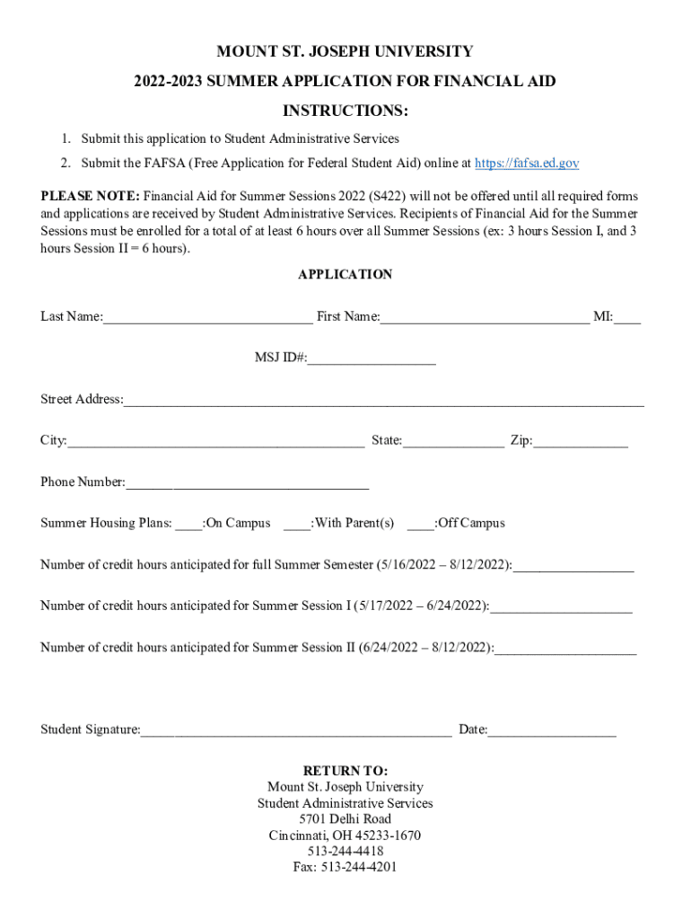 MOUNT ST. JOSEPH UNIVERSITY 20222023 SUMMER APPLICATION FOR FINANCIAL AID INSTRUCTIONS: 1. Submit this application to Student Administrative Services 2. Submit the FAFSA (Free Application for Federal