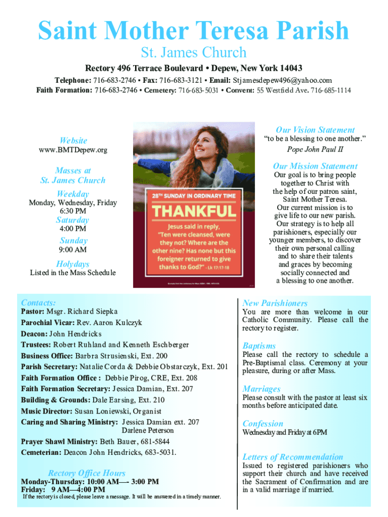 Saint Mother Teresa Parish St. James ChurchRectory 496 Terrace Boulevard Deep, New York 14043 Telephone: 7166832746 Fax: 7166833121 Email: Stjamesdepew496@yahoo.com Faith Formation: 7166832746 Cemetery: