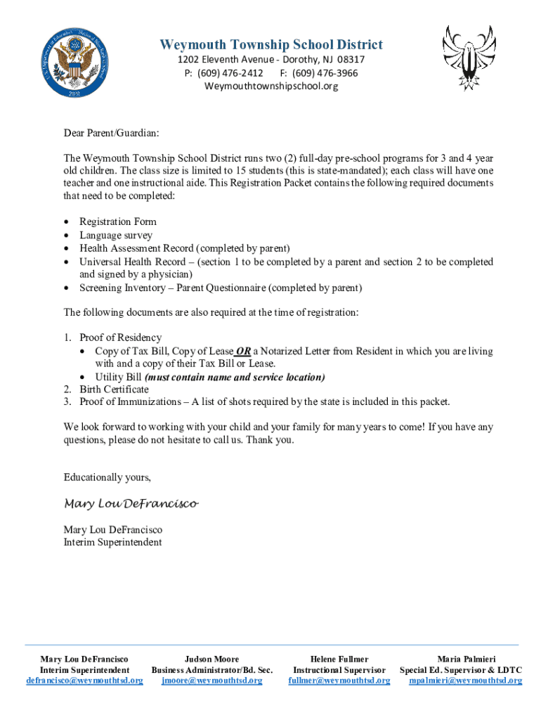 Weymouth Township School District 1202 Eleventh Avenue Dorothy, NJ 08317 P: (609) 4762412 F: (609) 4763966 Weymouthtownshipschool. Order Parent/Guardian: The Weymouth Township School District runs