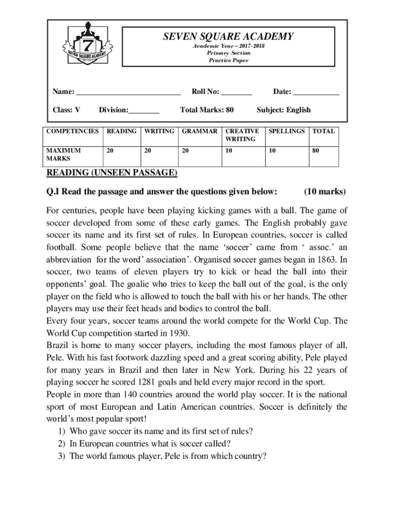SEVEN SQUARE ACADEMY Academic Year 20172018 Primary Section Practice Paperback: ___ Class: Division:___Roll No: ___Total Marks: 80Date: ___ Subject: EnglishCOMPETENCIESREADINGWRITINGGRAMMARCREATIVE