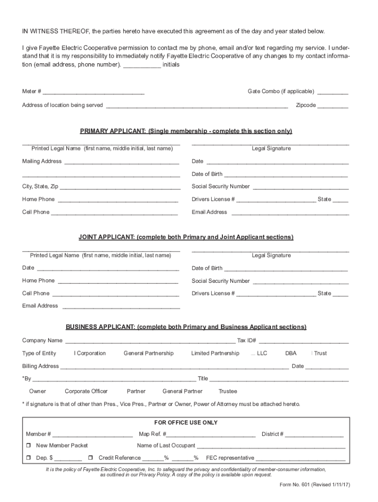 APPLICATION FOR MEMBERSHIP AND ELECTRIC SERVICE AGREEMENT Fayette Electric Cooperative, Inc. P.O. Box 490 La Grange, TX 78945 This application serves as proof of membership. A copy is available to