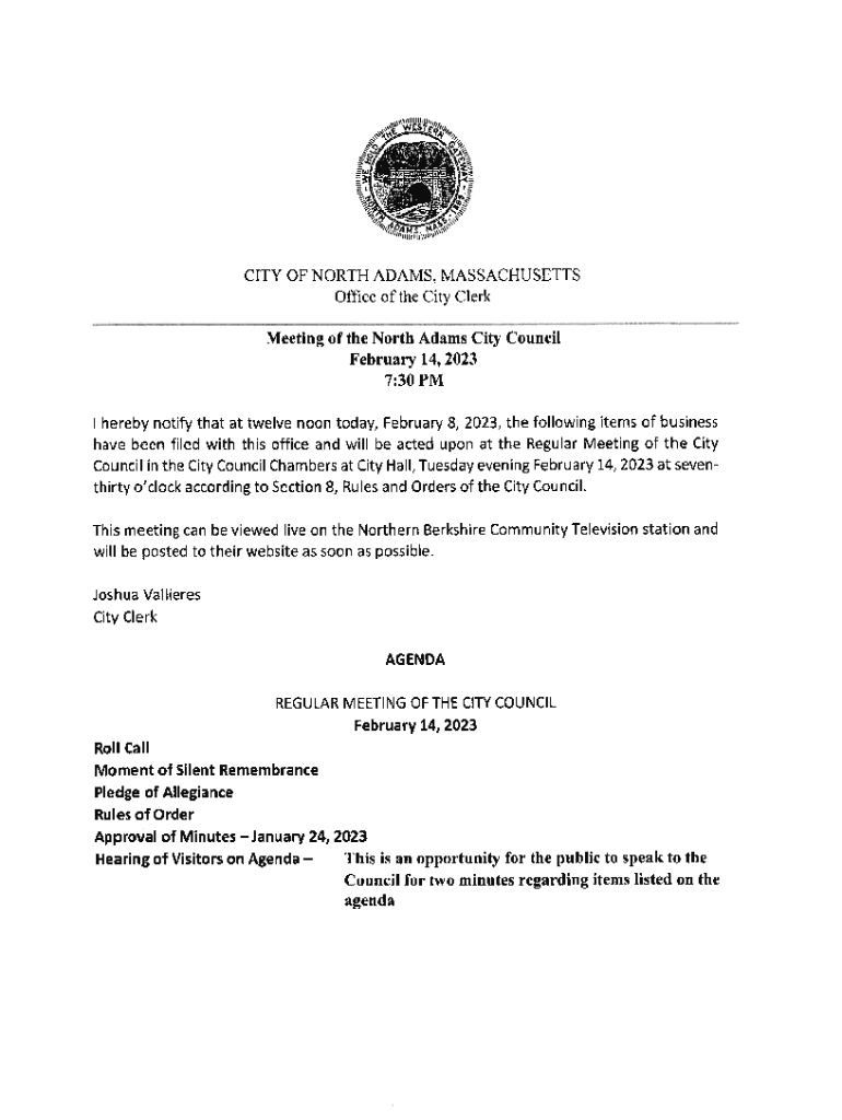 CITY OF NORTH ADAMS, MASSACHUSETTS Office of the City Clerk Meeting of the North Adams City Council February 14, 2023 7:30 PM I hereby notify that at twelve noon today, February 8, 2023, the following