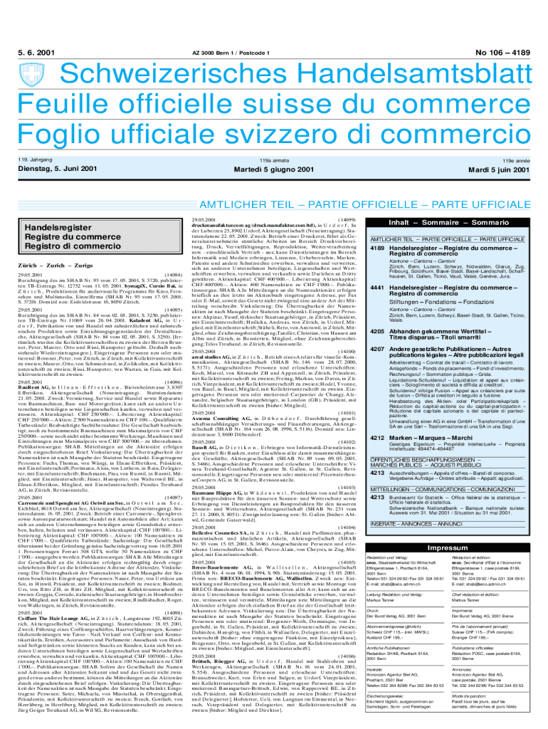 5. 6. 2001No 106 4189AZ 3000 Bern 1 / Postcode 1Schweizerisches Handelsamtsblatt
