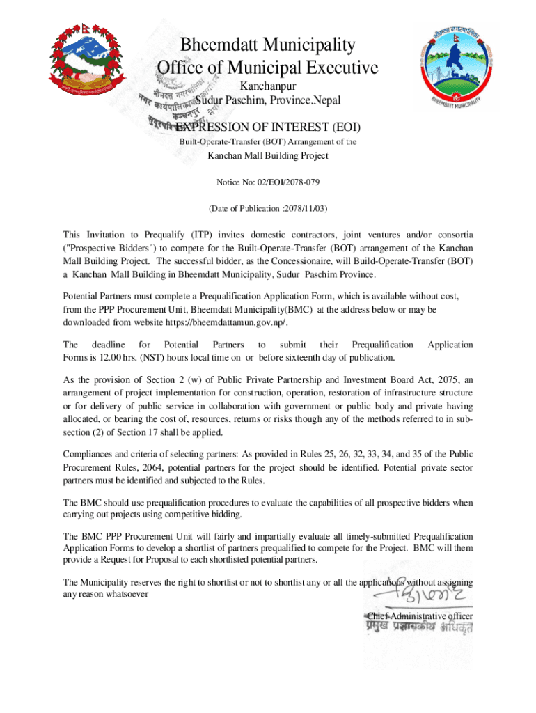 Bheemdatt Municipality Office of Municipal Executive Khanpur Suburb Paschal, Province. Nepal EXPRESSION OF INTEREST (EOI) BuiltOperateTransfer (BOT) Arrangement of theKanchan Mall Building Project