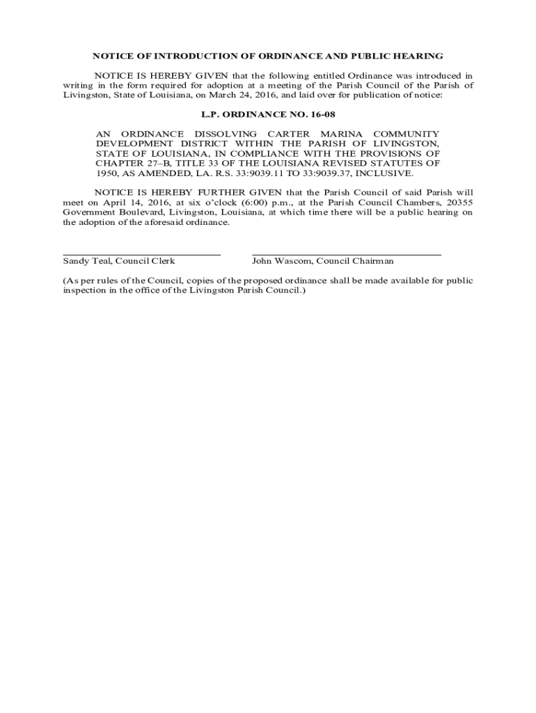 Get the free NOTICE IS HEREBY GIVEN that the following entitled Ordinance was introduced in