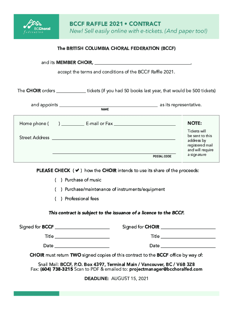 BCC RAFFLE 2021 CONTRACT New! Sell easily online with tickets. (And paper too!) The BRITISH COLUMBIA CHORAL FEDERATION (BCC) and its MEMBER CHOIR, ___, accept the terms and conditions of the BCC Raffle