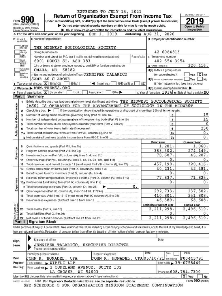 EXTENDED TO JULY 15, 2021990Form (Rev. January 2020)Return of Organization Exempt From Income Tax OMB No. 15450047| Do not enter social security numbers on this form as it may be made public. Open