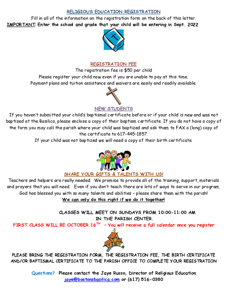 RELIGIOUS EDUCATION REGISTRATION Fill in all the information on the registration form on the back of this letter. IMPORTANT: Enter the school and grade that your child will be entering in Sept. 2022REGISTRATION