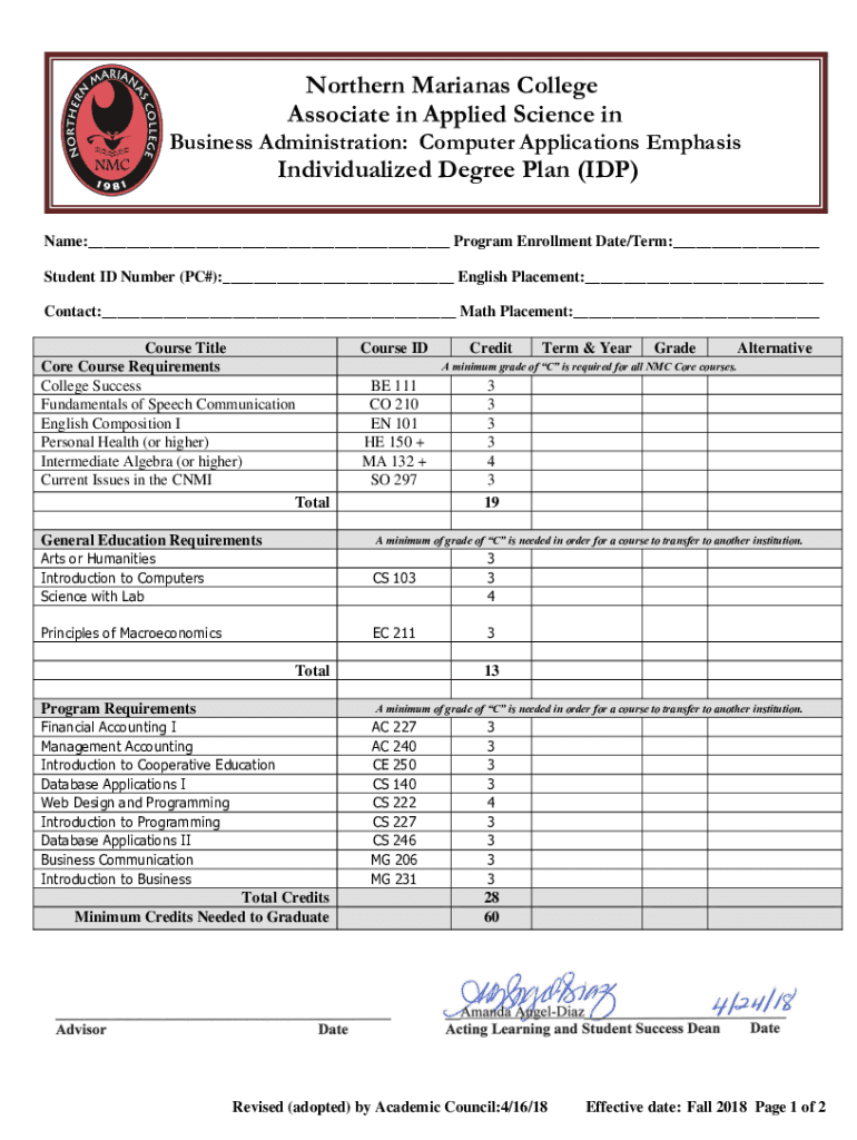Business Administration: Computer Applications EmphasisIndividualized Degree Plan (IDP)Name:___ Program Enrollment Date/Term:___