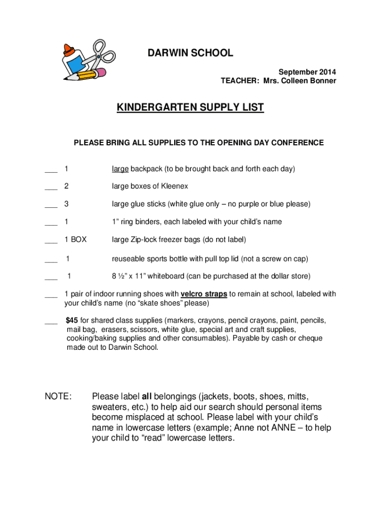 DARWIN SCHOOL September 2014 TEACHER: Mrs. Colleen BonnerKINDERGARTEN SUPPLY DISPLEASE BRING ALL SUPPLIES TO THE OPENING DAY CONFERENCE ___ 1large backpack (to be brought back and forth each day)___