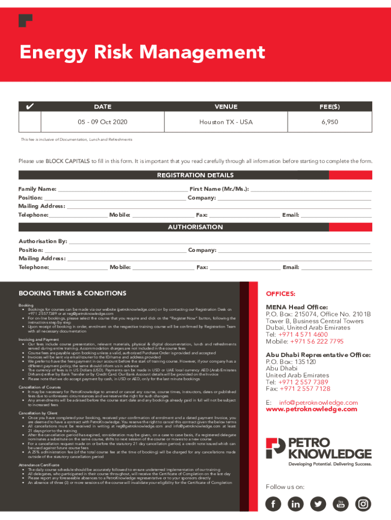 An Intensive 5-Day Training CourseEnergy Risk Management30DEC1905 09 Oct 2020, HoustonThis course is Designed, Developed, and will be Delivered under ISO 29990 : 2010 & ISO9001 : 2015 Quality StandardsEnergy