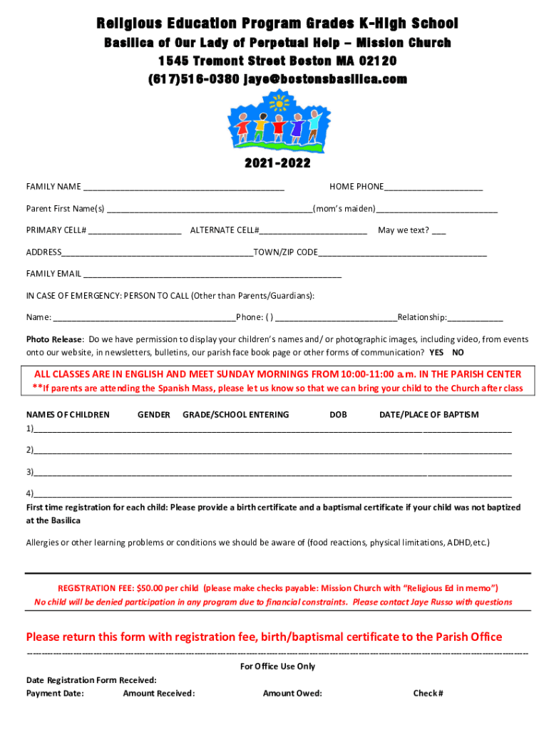 (617)5160380 jaye@bostonsbasilica.com20212022FAMILY NAME ___HOME PHONE___Parent First Name(s) ___(moms maiden)___PRIMARY CELL# ___ALTERNATE CELL#___May we text? ___ADDRESS___TOWN/ZIP CODE___FAMILY EMAIL ___IN CASE OF EMERGENCY: PERSON TO CALL (Other than Parents/Guardians):Name: ___Phone: () ___Relationship:___Photo Release:Do we have permission
