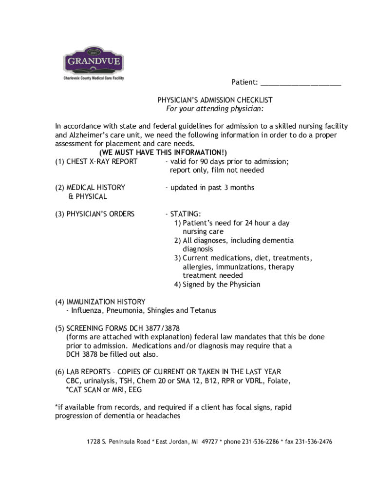 Patient: ___ PHYSICIANS ADMISSION CHECKLIST For your attending physician: In accordance with state and federal guidelines for admission to a skilled nursing facility and Alzheimer's care unit, we