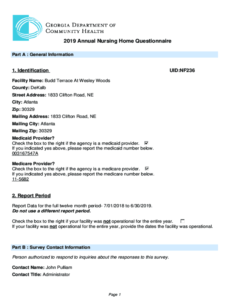 2019 Annual Nursing Home Questionnaire Part A : General Information1. Identification:NF236Facility Name: Bud Terrace At Wesley Woods County: DeKalb Street Address: 1833 Clifton Road, NE City: Atlanta
