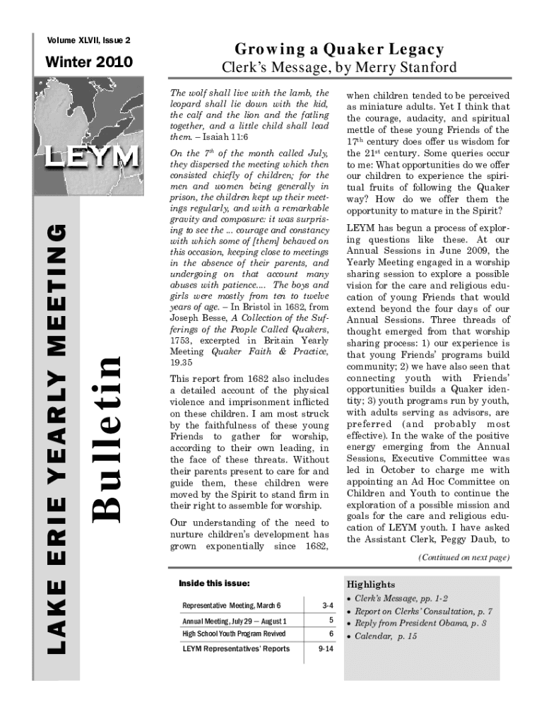 Volume CLVII, Issue 2Winter 2010Growing a Quaker Legacy Clerks Message, by Merry StanfordBulletinL A K E E R I E Y E A R LY M E E T I NG The wolf shall live with the lamb, the leopard shall lie down