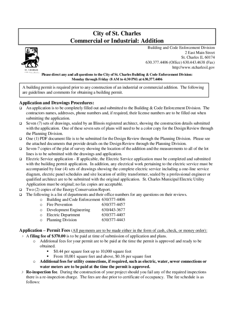 City of St. Charles Commercial or Industrial: Addition Building and Code Enforcement Division 2 East Main Street St. Charles IL 60174 630.377.4406 (Office) 630.443.4638 (Fax) http://www.stcharlesil.gov