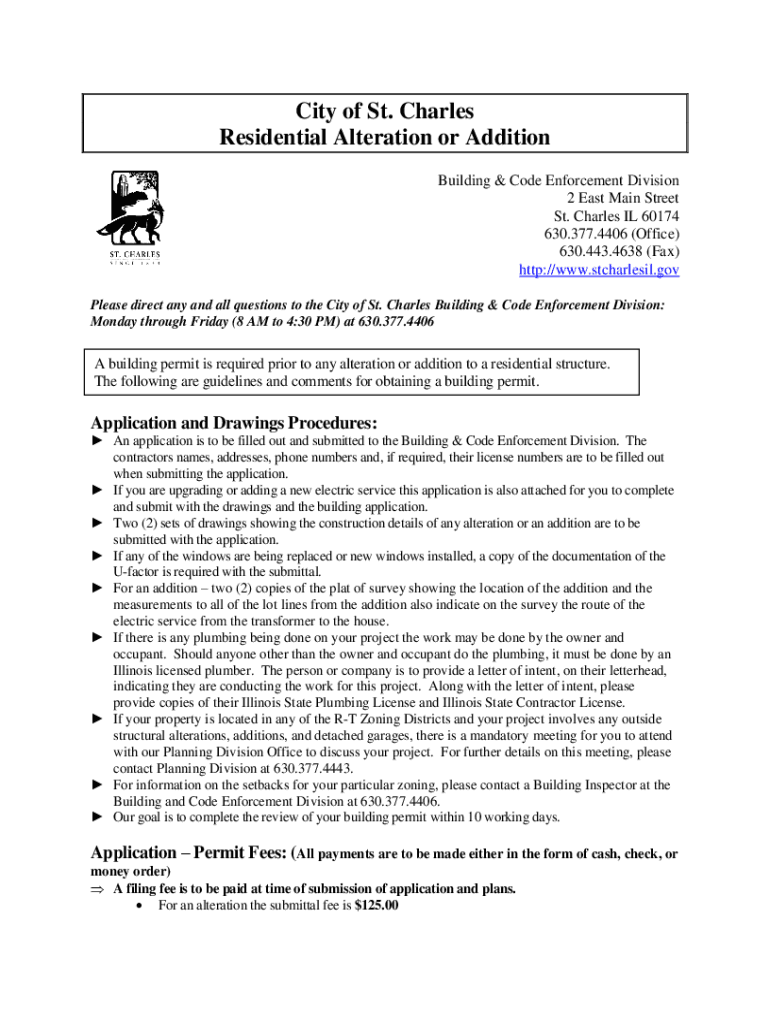 City of St. Charles Residential Alteration or Addition Building & Code Enforcement Division 2 East Main Street St. Charles IL 60174 630.377.4406 (Office) 630.443.4638 (Fax) http://www.stcharlesil.gov