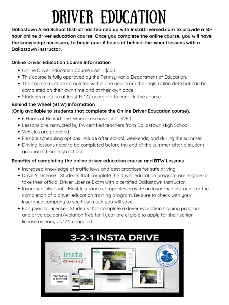 Driver Education Dallas town Area School District has teamed up with InstaDriversed.com to provide a 30hour online driver education course. Once you complete the online course, you will have the knowledge