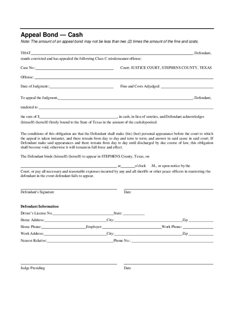 Note: The amount of an appeal bond may not be less than two (2) times the amount of the fine and costs.