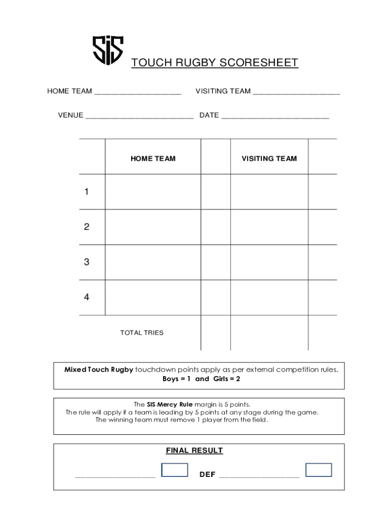 TOUCH RUGBY SCORESHEET HOME TEAM ___VISITING TEAM ___VENUE ___ DATE ___HOME REVISITING TEAM1234TOTAL Remixed Touch Rugby touchdown points apply as per external competition rules. Boys 1 and Girls
