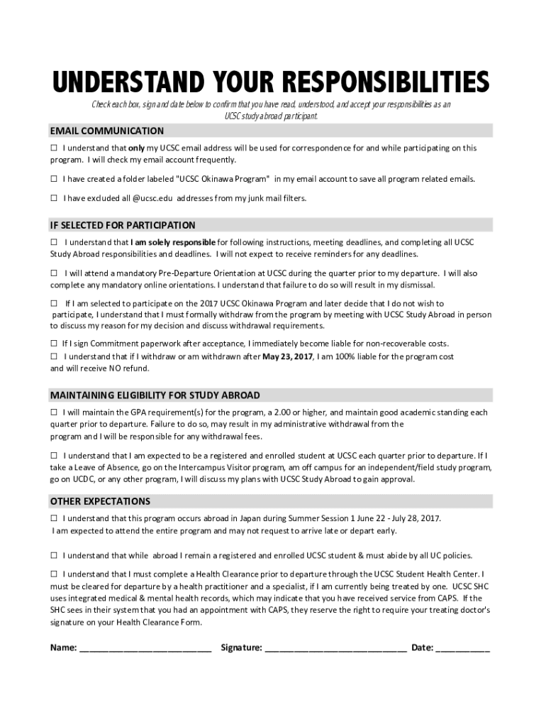 UNDERSTAND YOUR RESPONSIBILITIES Check each box, sign and date below to confirm that you have read, understood, and accept your responsibilities as an UCSC study abroad participant.EMAILCOMMUNICATIONIunderstandthatonlymyUCSCemailaddresswillbeusedforcorrespondenceforandwhileparticipatingonthis