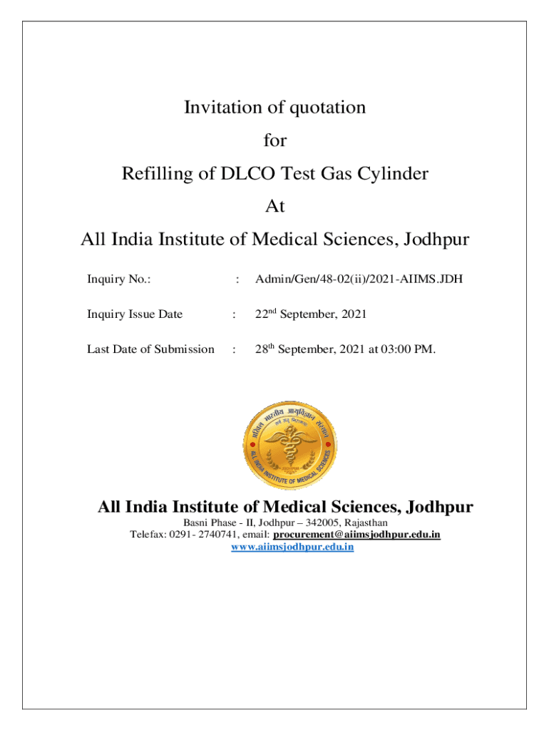 Invitation of quotation for Refilling of DCO Test Gas Cylinder At All India Institute of Medical Sciences, Jodhpur Inquiry No.::Admin/Gen/4802(ii)/2021AIIMS. Inquiry Issue Date:22nd September, 2021Last