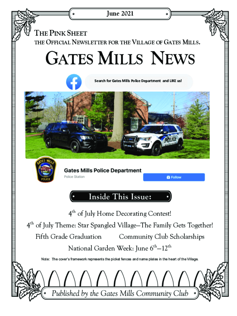 June 2021THE PINK SHEET THE OFFICIAL NEWSLETTER FOR THE VILLAGE OF GATES MILLS.GATES MILLS NEWS ea DI research for Gates Mills Police Department and LIKE us! Place you are m essay e h ere. For maxim