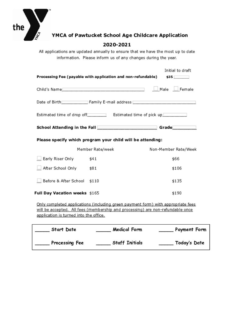 YMCA of Pawtucket School Age Childcare Application 20202021 All applications are updated annually to ensure that we have the most up to date information. Please inform us of any changes during the
