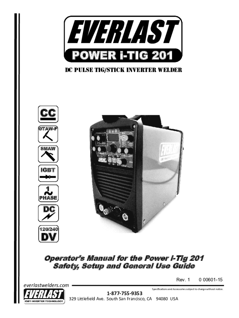 EVERLAST POWER ITIL 201 DC Pulse TIG/Stick Inverter welder CC GTAWPSMAWIGBT1PHASEDC 120/240DVOperators Manual for the Power ITIL 201 Safety, Setup and General Use Guide Rev. 1everlastwelders.com 187775593530