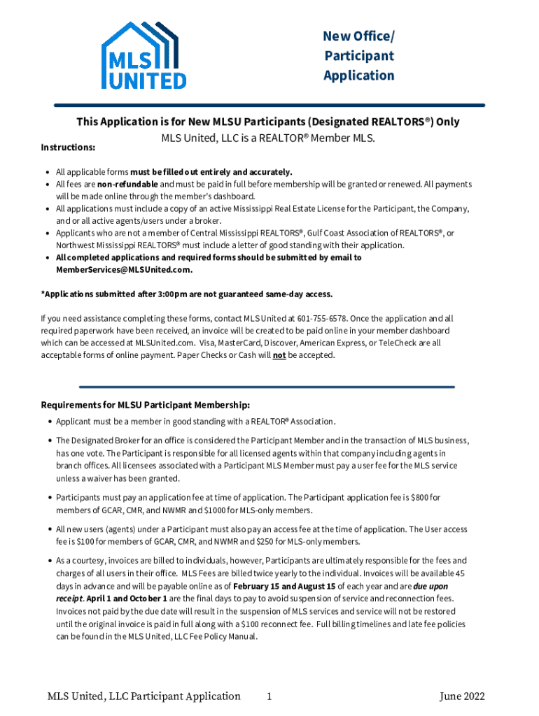 New Office/ Participant Application This Application is for New MSU Participants (Designated REALTORS) Only MLS United, LLC is a REALTOR Member MLS. Instructions:All applicable forms must be filled