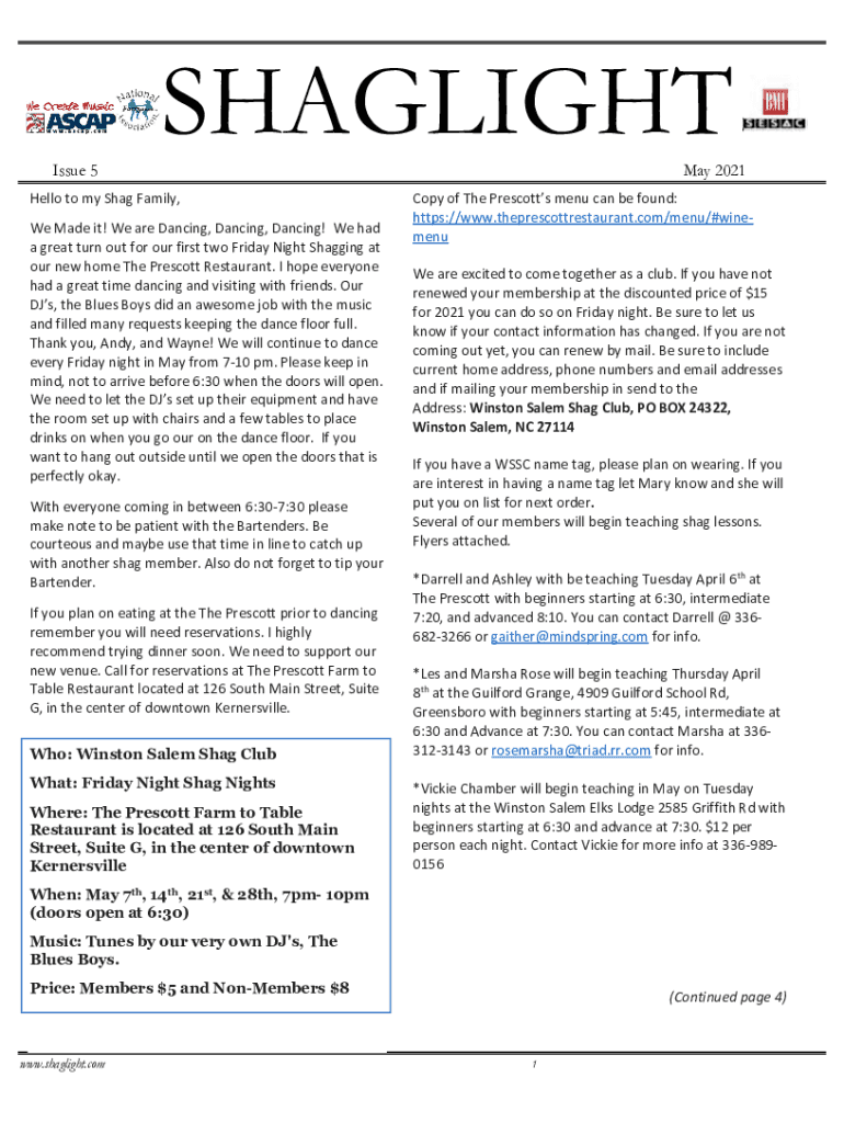 STARLIGHT Issue 5 Hello to my Shag Family, We Made it! We are Dancing, Dancing, Dancing! We had a great turn out for our first two Friday Night Shagging at our new home The Prescott Restaurant. I