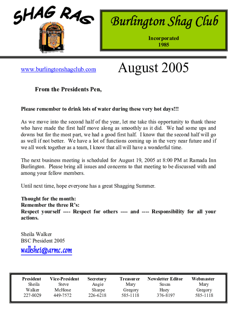 Burlington Shag Club Incorporated 1985www.burlingtonshagclub.com August 2005From the Presidents Pen, Please remember to drink lots of water during these very hot days!!! As we move into the second