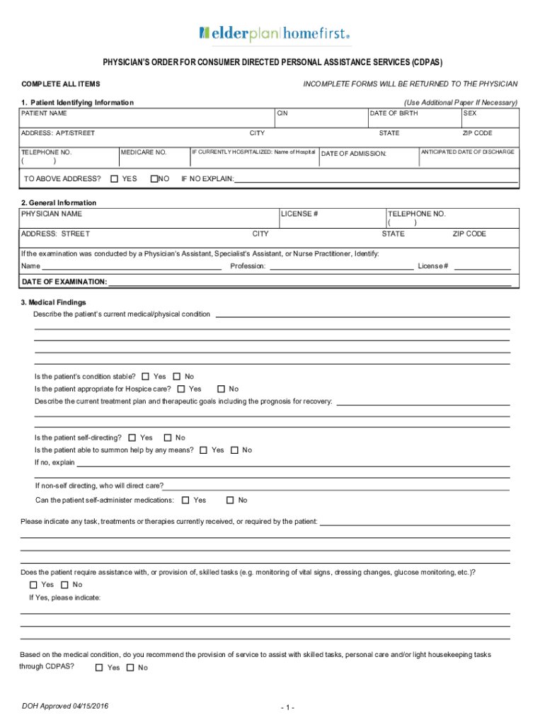 PHYSICIANS ORDER FOR CONSUMER DIRECTED PERSONAL ASSISTANCE SERVICES (CD PAS) COMPLETE ALL ITEMSINCOMPLETE FORMS WILL BE RETURNED TO THE PHYSICIAN (Use Additional Paper If Necessary)1. Patient Identifying