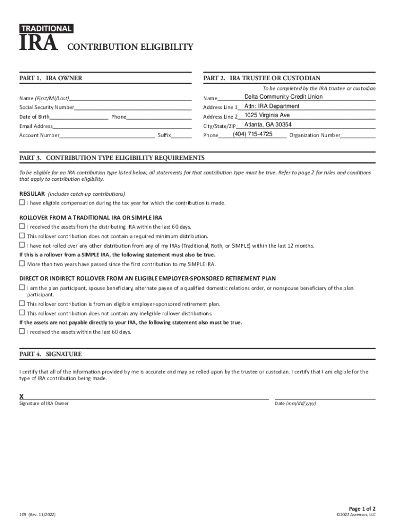 Traditional CONTRIBUTION ELIGIBILITY PART 1. IRA COUNTERPART 2. IRA TRUSTEE OR CUSTODIANName (First/MI/Last)Name be completed by the IRA trustee or custodian Delta Community Credit Nonsocial Security