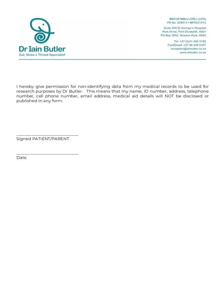 I hereby give permission for nonidentifying data from my medical records to be used for research purposes by Dr Butler. This means that my name, ID number, address, telephone number, cell phone number,