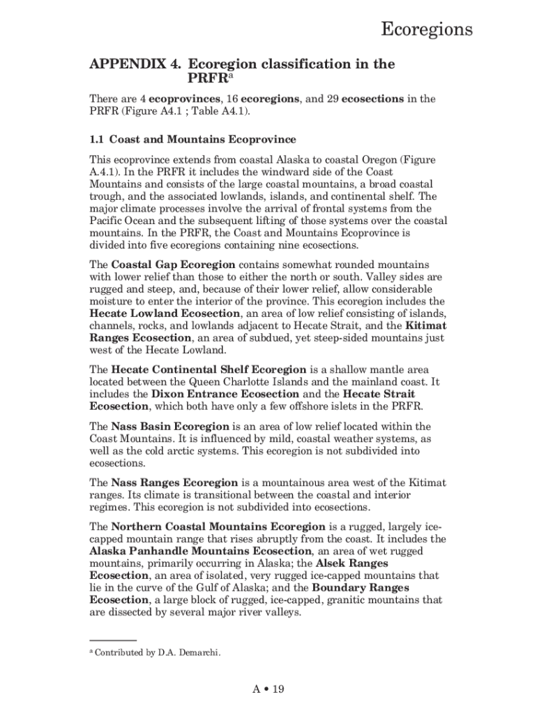 Eco regions APPENDIX 4. Eco region classification in the PRF Ra There are 4 provinces, 16 bioregions, and 29 elections in the PFR (Figure A4.1 ; Table A4.1). 1.1 Coast and Mountains Eco province This